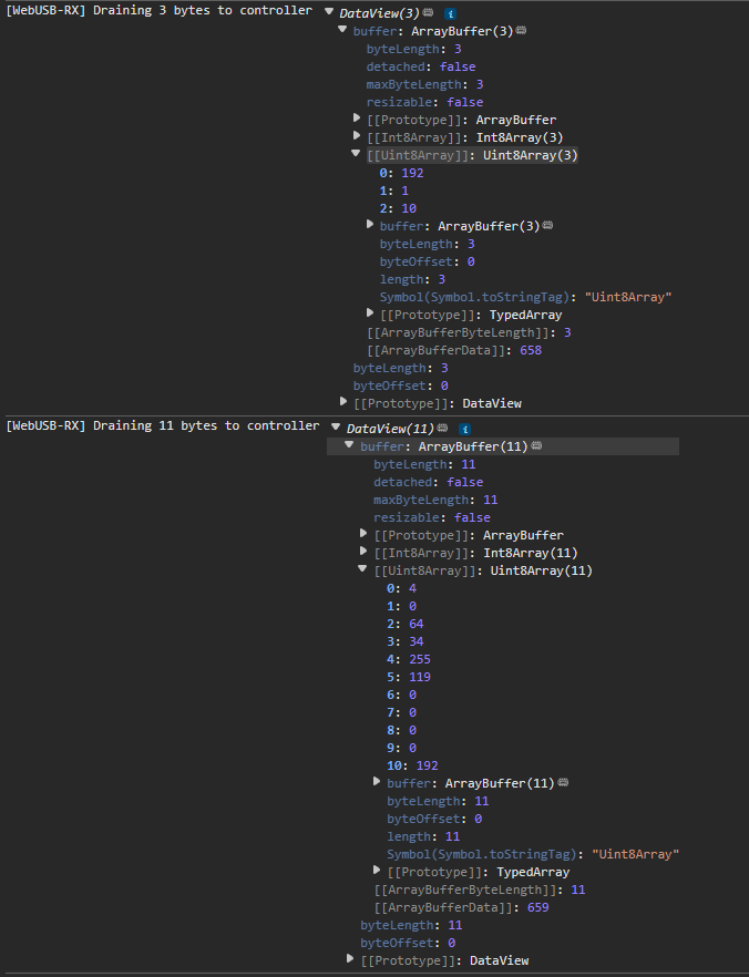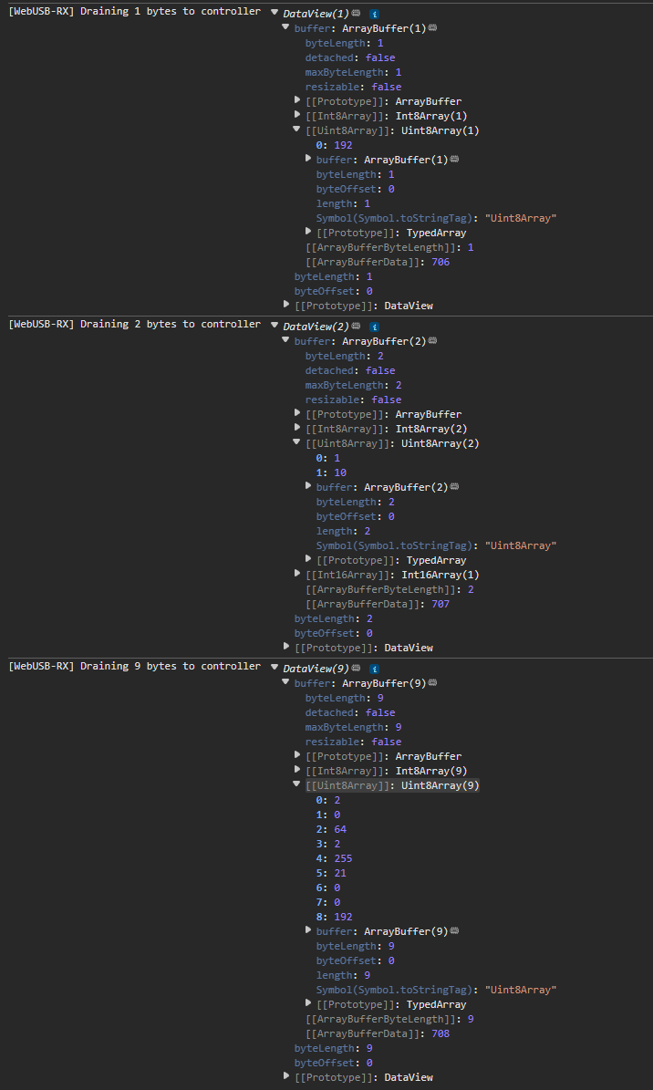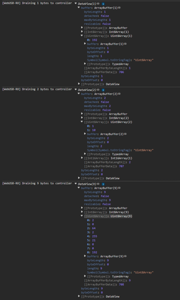 If there are now multiple smaller USB bulk transfer responses in quick succession, I am afraid, that they are not buffered until I queue a bulk read using device.transferIn(). But then why is the two-bulk bootloader transfer working and the three-bulk stub-transfer not so much? Does the WebUSB use some double-buffer like queueing and drops the third bulk transfer?