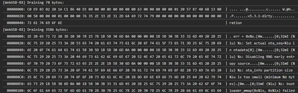 After digging for a while, I made one observation I didn’t expect. When calling the “Read Register” command, the ESP32 ROM bootloader returns two bulk transfers. For a single 14 byte response I was expecting.