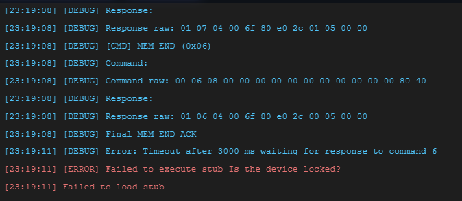 When the stub loader, required for reading flash, was loaded, the “Read Register” command simply timed out. Sometimes. Not always. These are the worst kinds of errors: intermittent faults, unclear when and why.